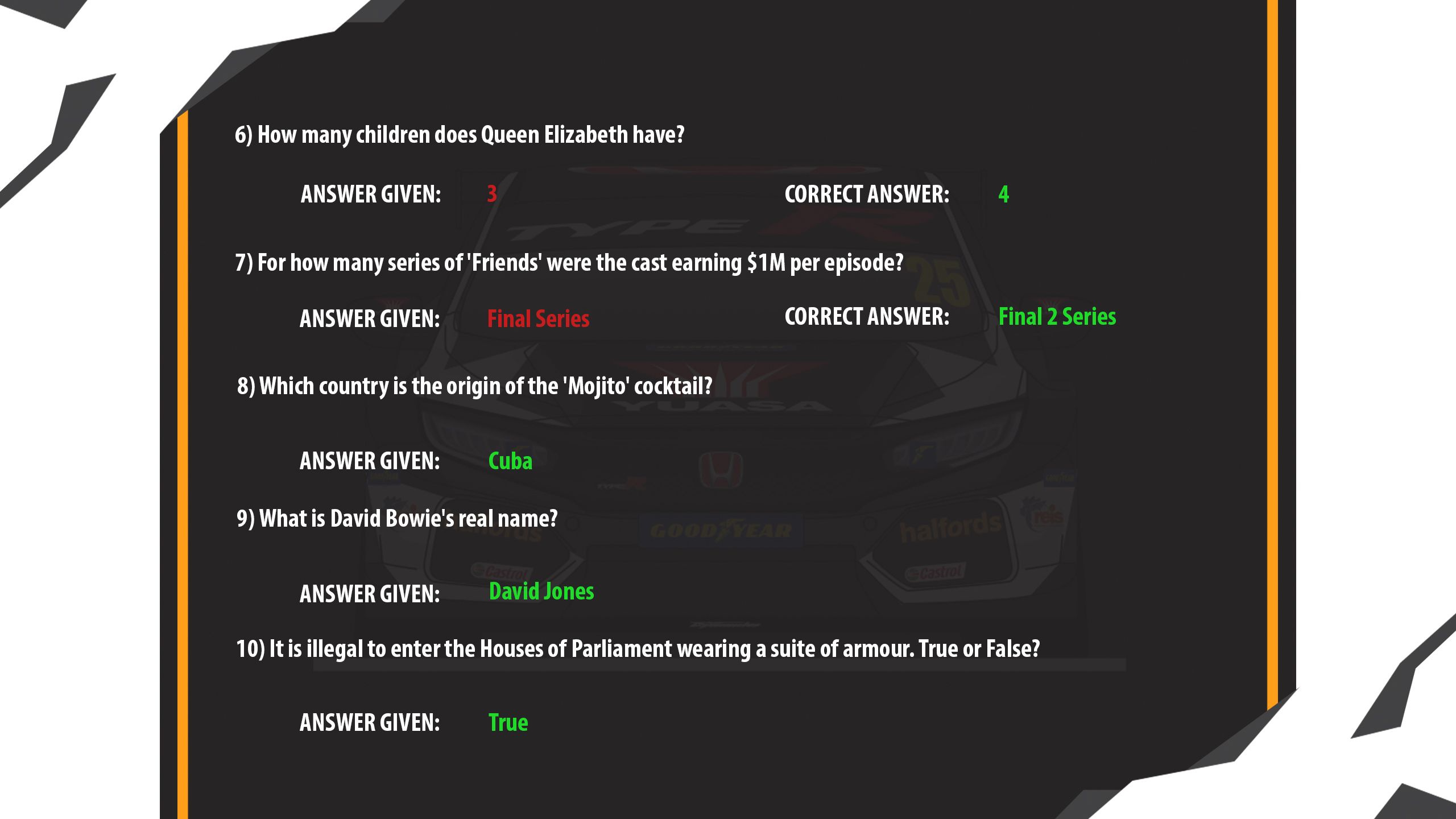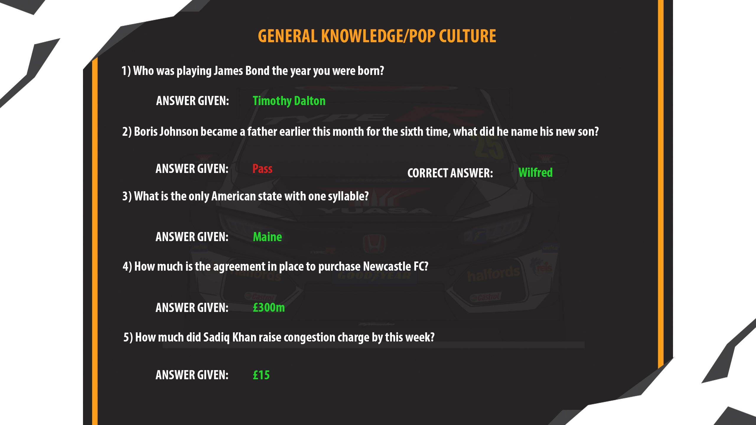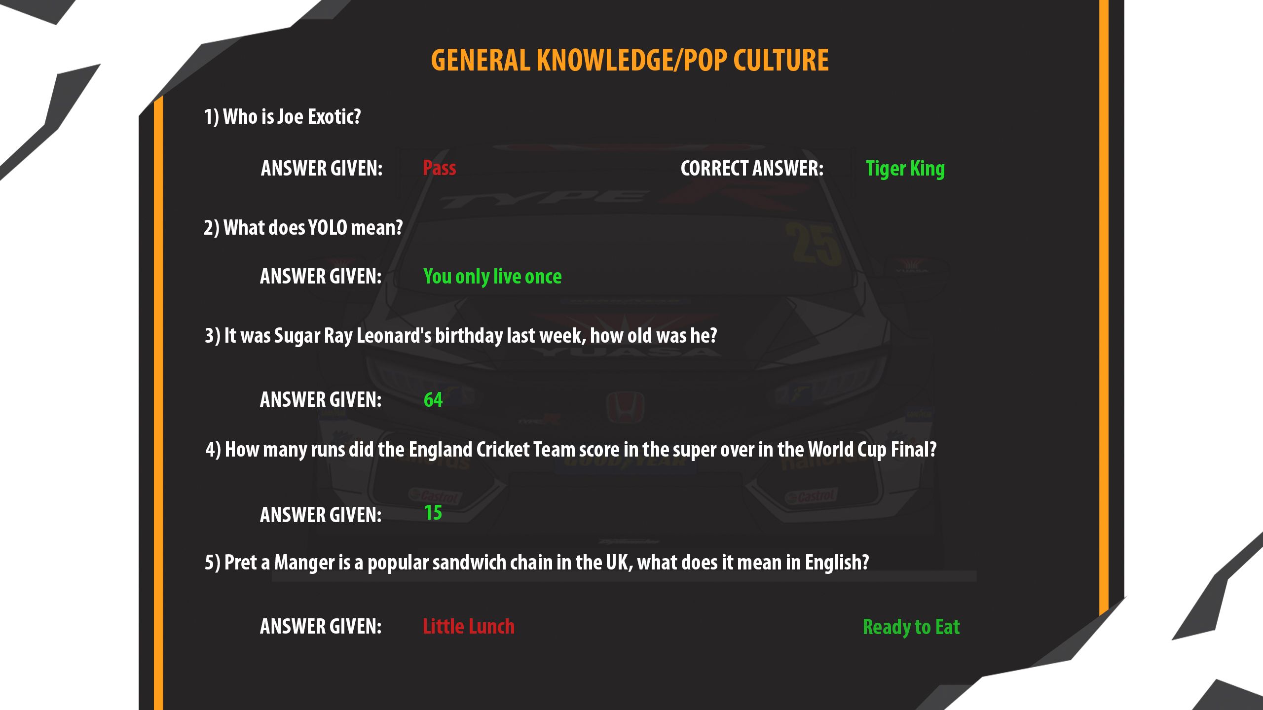 Check below for the answers the lads gave, alongside the correct answer when the incorrect answer was (often) given. With a strong degree of certainty, we can confirm that neither of our drivers will be quitting their day jobs.