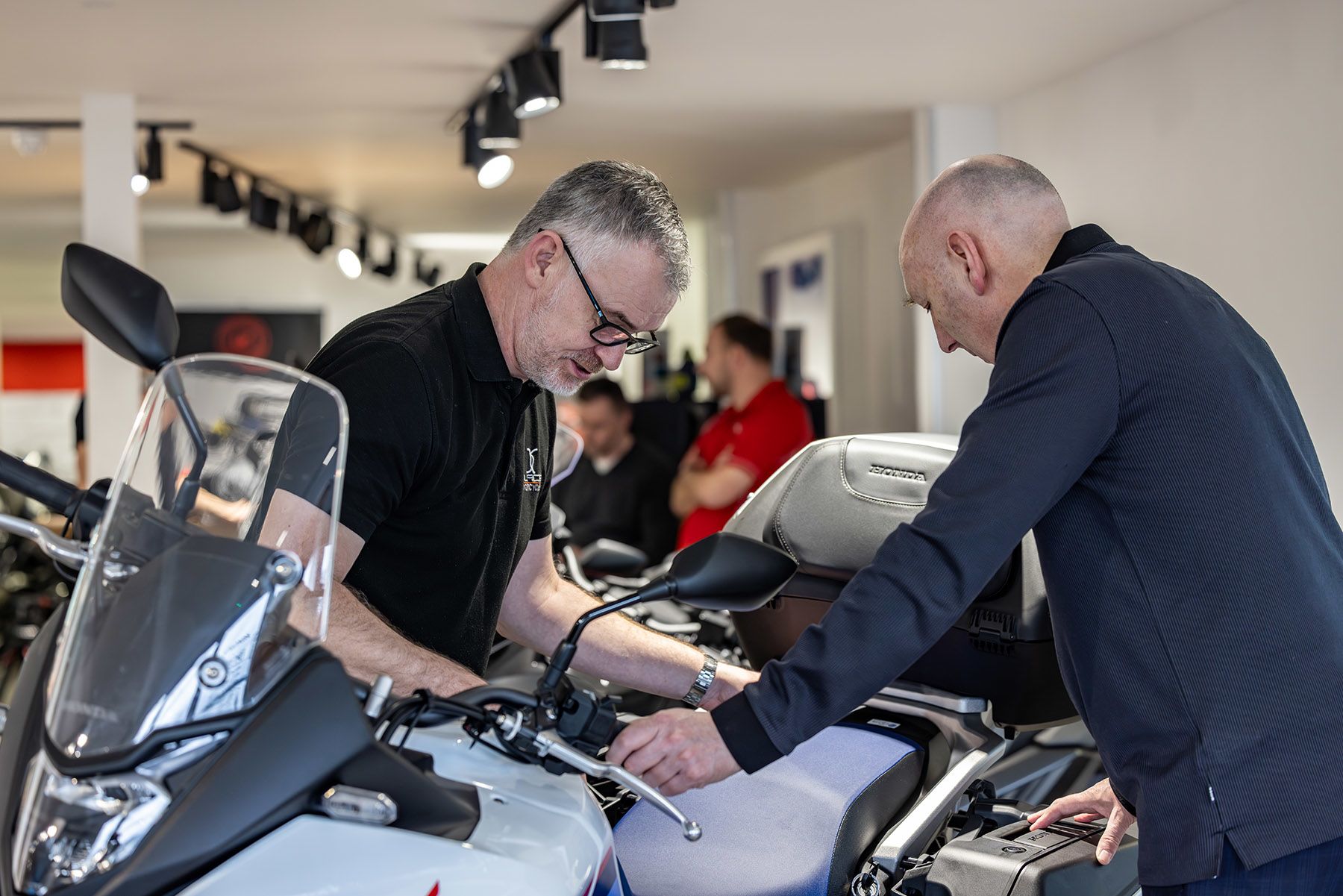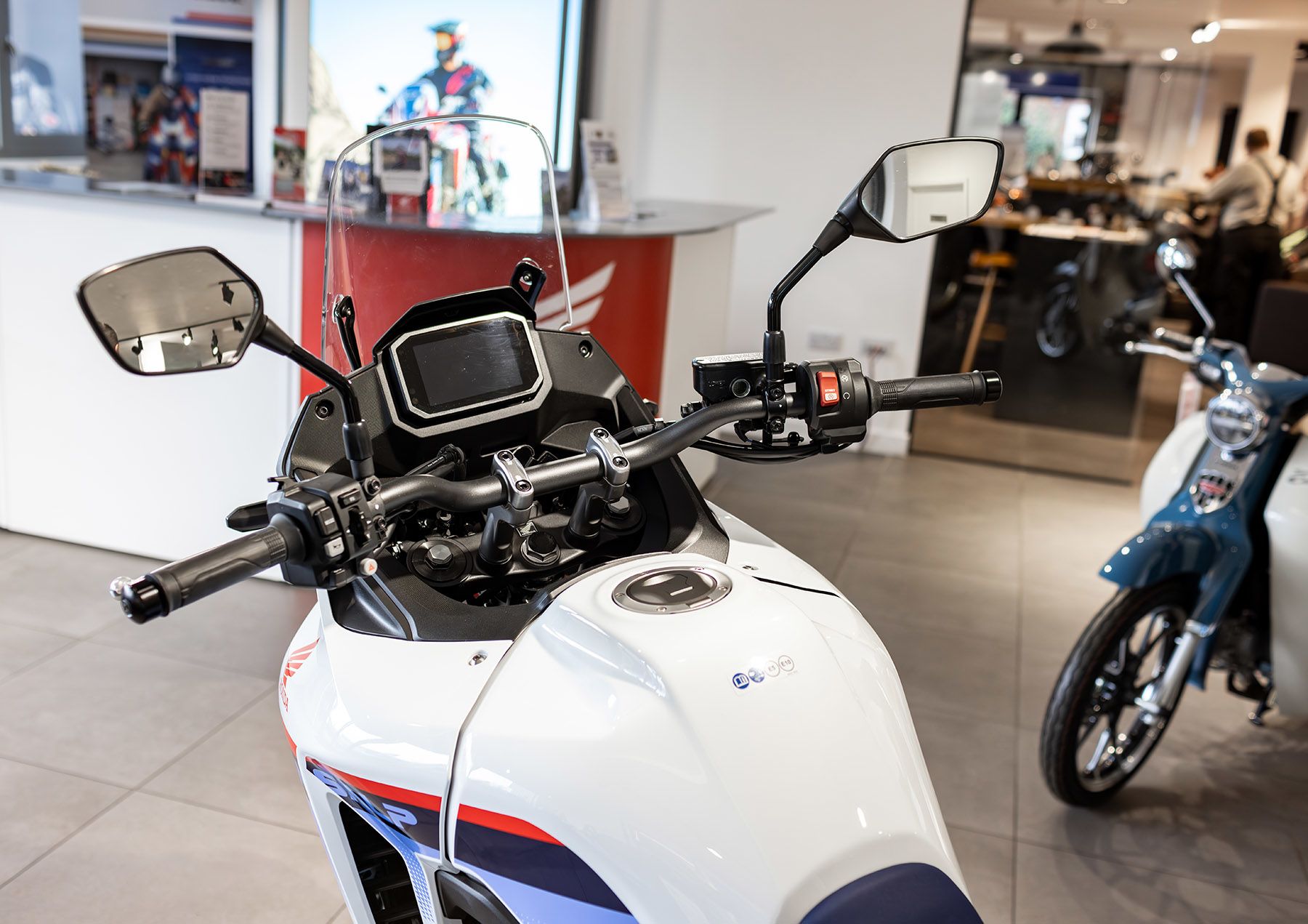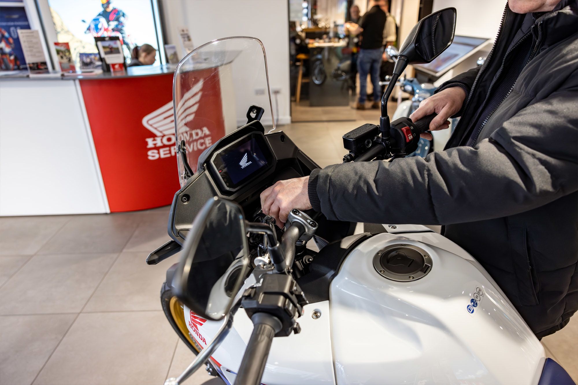 Blade Motorcycles sales executive Ed Cheshire gave John a comprehensive walk-through of the feature-packed adventure bike. After trying the Transalp for size, John declared the bike to be “absolutely stunning. It’s exactly what I’m looking for in a bike and as soon as the weather breaks, I’ll be heading for the hills,” he beamed.
