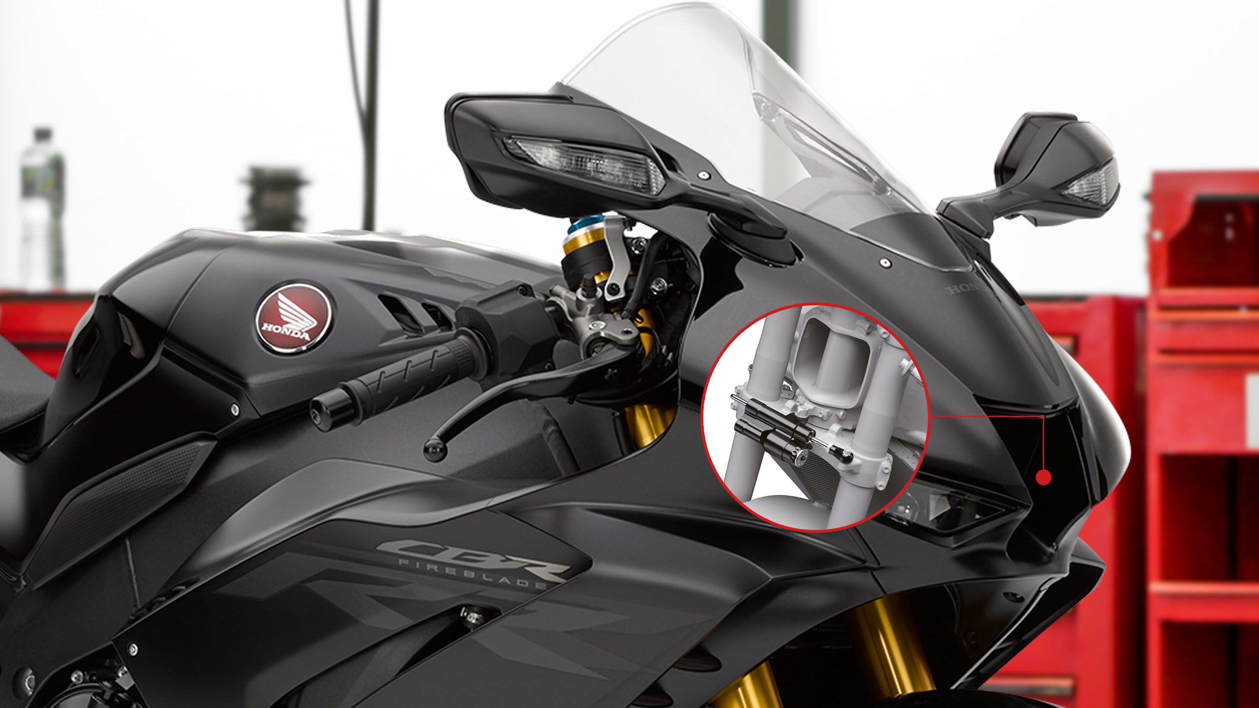 It’s a third-generation steering damper that comes as standard on the Fireblade. There are three modes that the rider can select from, each one providing different levels of feedback at low and high speed. In essence, at slow speed there is reduced amount of steering resistance. As speed increases so too does the amount of resistance through the bars. This damping force minimises the risk of head shake under acceleration, increases rider feel and provides consistent cornering performance. A lightweight through rod design, attached to the bottom yoke, this steering damper is sure to have a setting that suits your riding style.