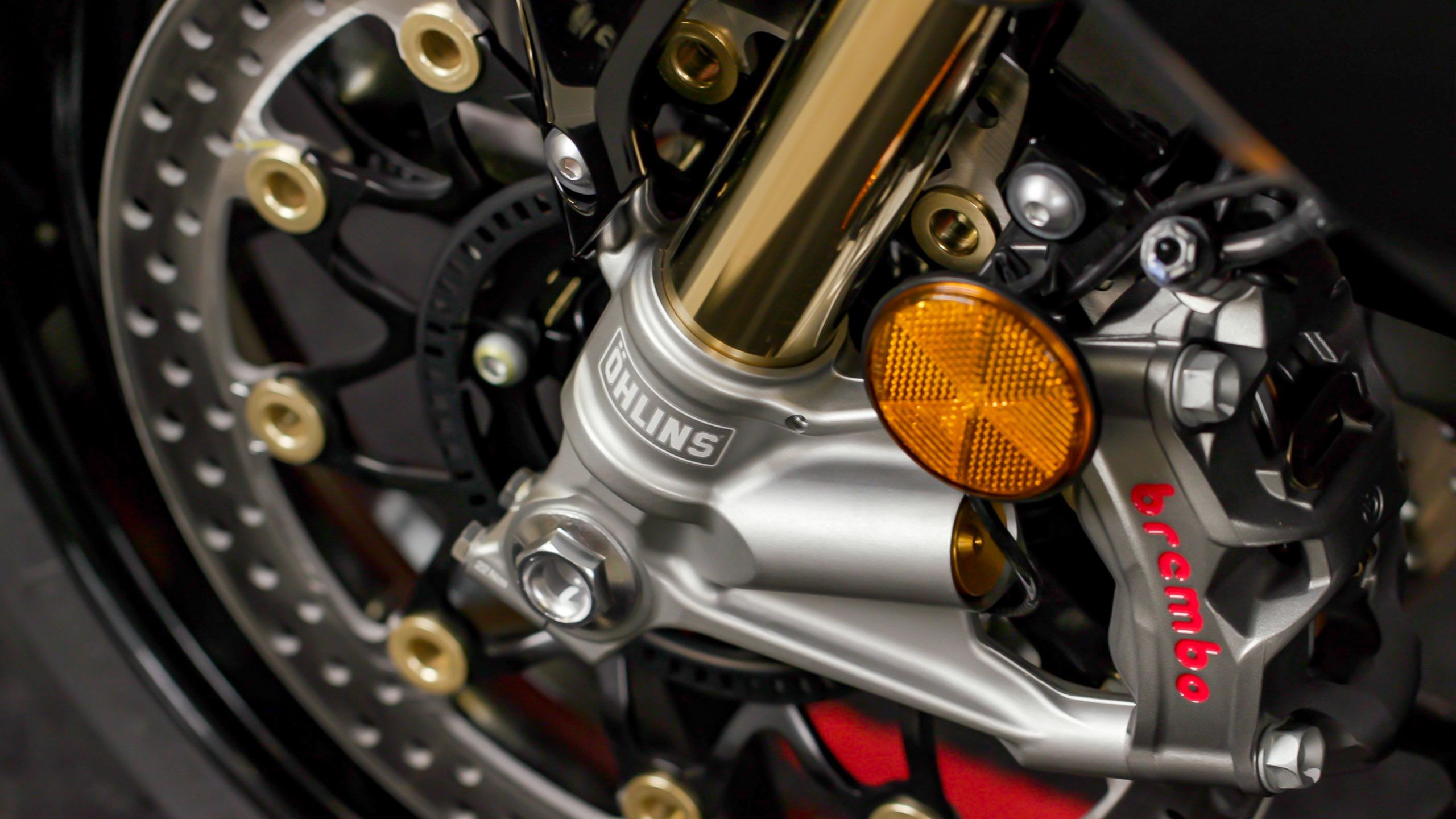 The semi active suspension is in its second generation on the Fireblade. Ohlins NPX forks use a pressurised damping system in order to minimise cavitation, improve grip and feel. In conjunction with the Ohlins shock at the rear, the rider is able to tailor suspension feel exactly as required using the OBTI (Objective Based Tuning Interface). Aside from the default settings available, it’s possible to make use of three individual modes. It’s possible that you might want a wet set up for your commute, a dry set up for your favourite weekend commute and a track set up exactly how you want it. This system allows that at the touch of a button, with all of the relevant information displayed through a full colour five in TFT dash.