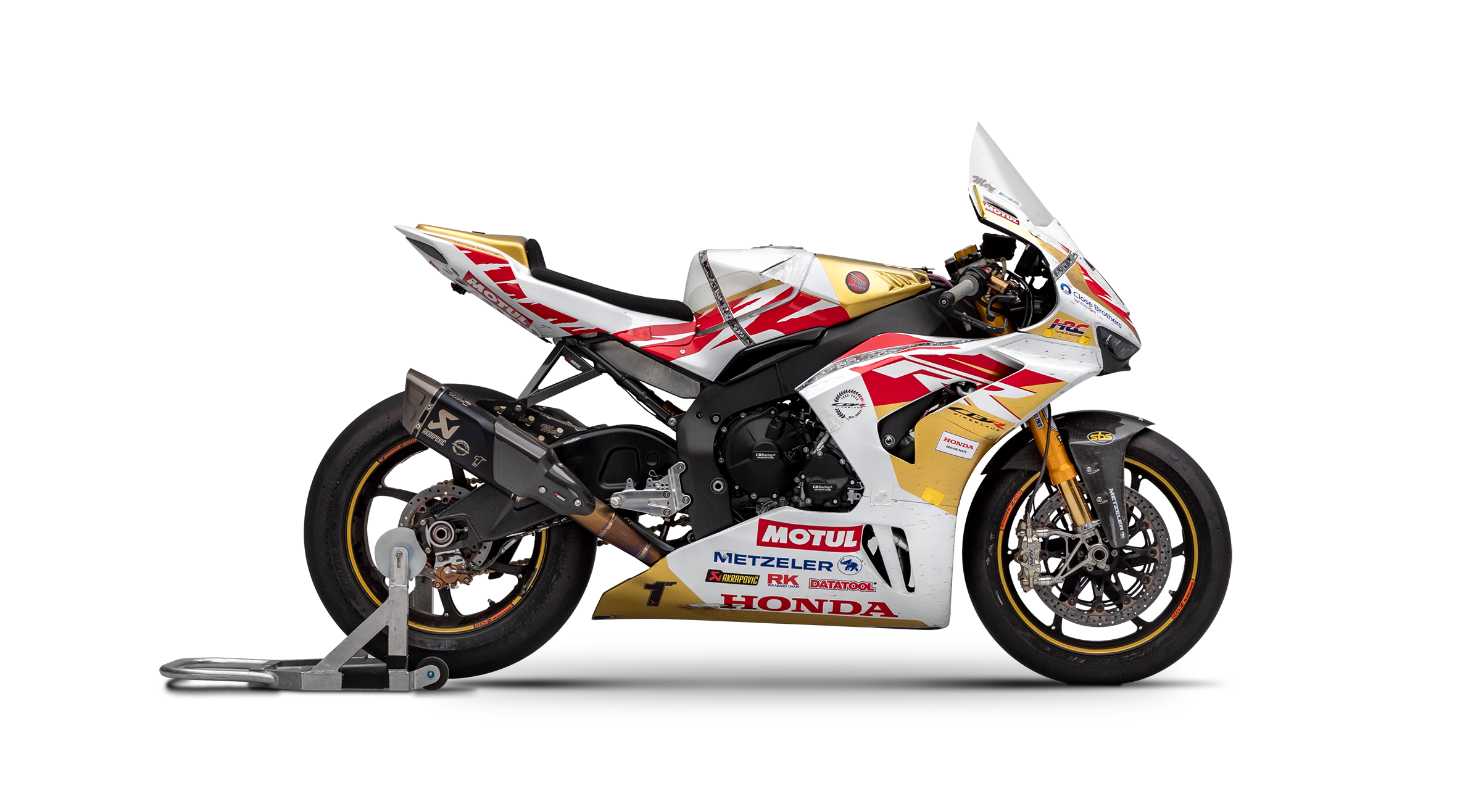 The John McGuinness 100th TT Start Fireblade SP features a replica paint scheme, a personally autographed airbox cover and an individually numbered plaque on the headstock. Gold detailing mirrors the livery of the history-making Fireblade ridden by John at the TT, while a film strip depicts each of his starts on the 37 3/4-mile Mountain Circuit. A 35% lighter carbon mudguard and 10% lighter carbon hugger – both Genuine Honda Accessories – reduce weight, and a rear seat cowl and TT-style taller screen complete the road racing look. Each bike is supplied with a custom Fireblade garage mat, a genuine Honda indoor dust cover and a 3D laser-engraved crystal featuring a design of the McGuinness replica.
