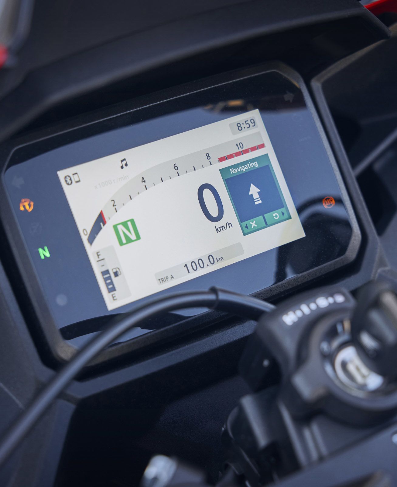The consul is compatible with the IOS/Android Smartphone connectivity of Honda RoadSync. Function control is via a backlit 4-way toggle switch on the left handlebar. The switch is suitable for glove-friendly, on-screen turn-by-turn navigation and also allows the rider to make calls or listen to music.