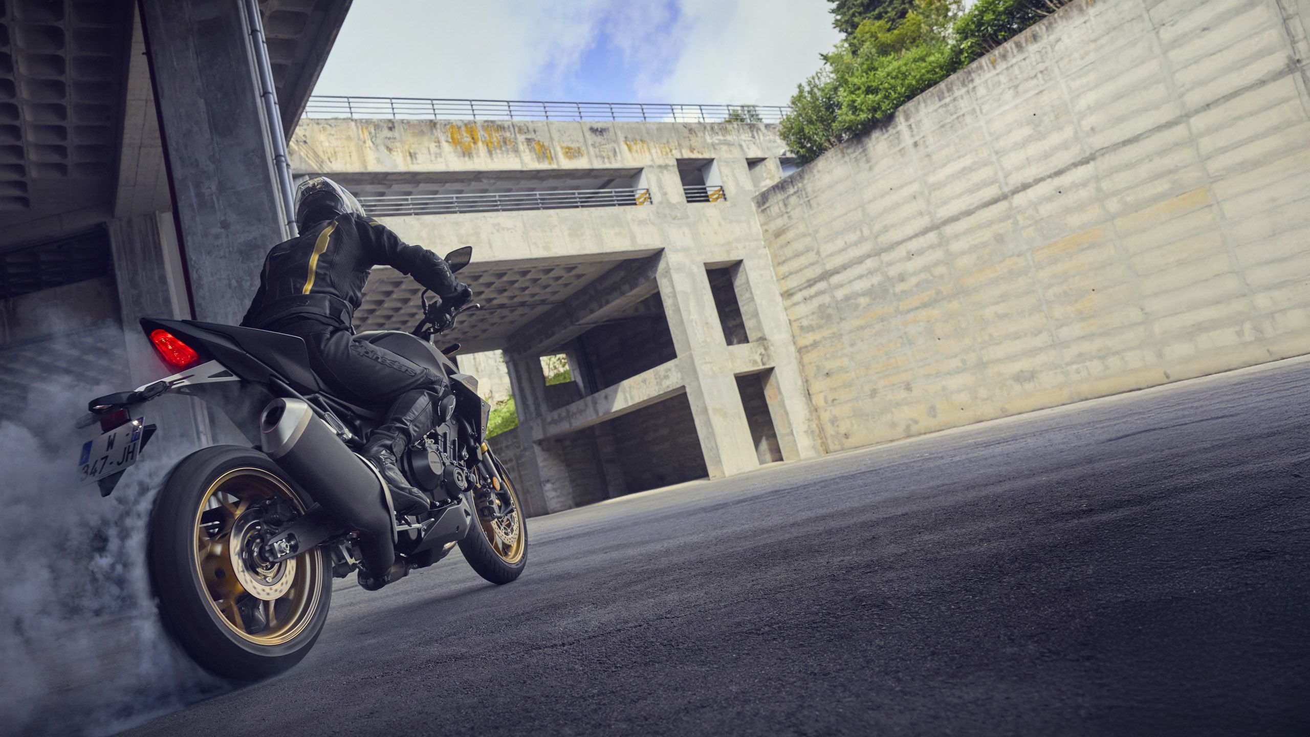 It’s got the incredible engine. The hardcore streetfighter looks. But the CB1000 Hornet is also built to handle. From urban jungle to winding back road. The one-piece steel twin-spar frame uses mass-forward geometry to weight the front wheel and ups torsional rigidity by 70%, for agile corner entry and razor-fast side-to-side performance. It also mounts a Showa rear shock operating through Pro-Link for perfect suspension control, matched by the steering precision of adjustable 41mm Showa SFF-BP USD front forks. You’ve also got the sharp stopping power of Nissin four-piston radial-mount front brake calipers gripping 310mm floating discs. And the wide handlebars and riding position that join you, as one, with the bike.