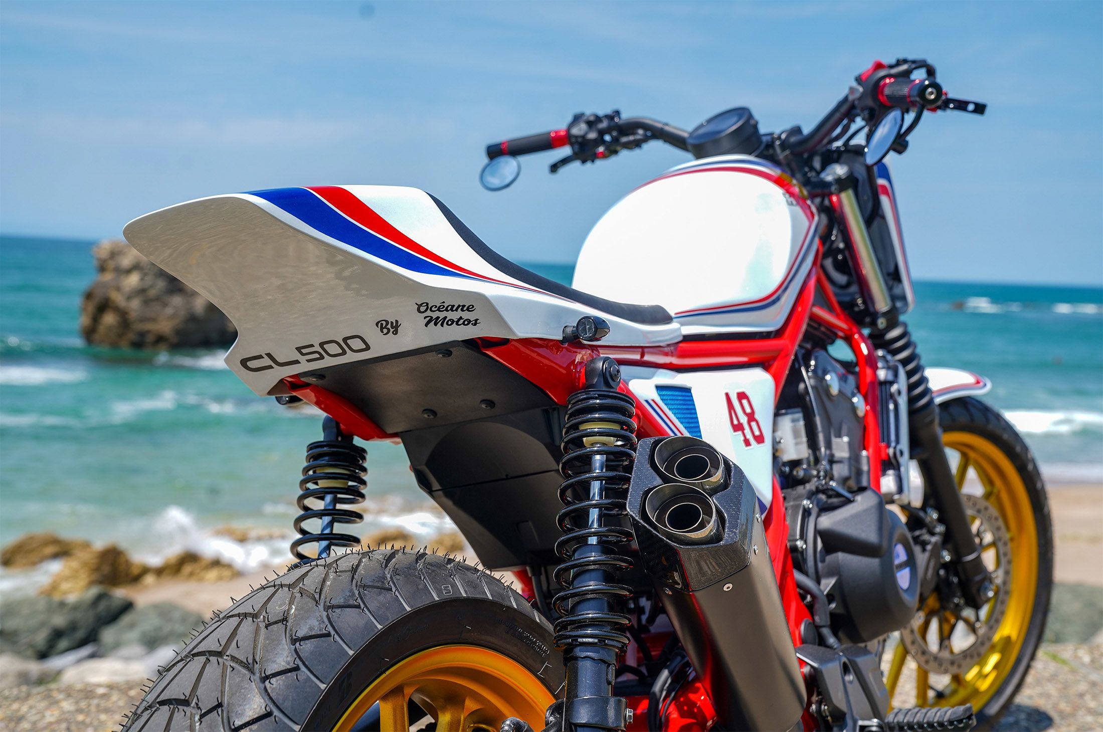 Created by Oceane Motos, Ocean’s Track rolls with an American flat track style with a hint of stunt bike about it, to eyeball-popping visual effect. The key changes over the standard CL500 are the red frame and swingarm, gold wheels, super wide handlebars complete with bar end mirrors, twin LED projector headlights off-set in the front number board and solo seat unit.