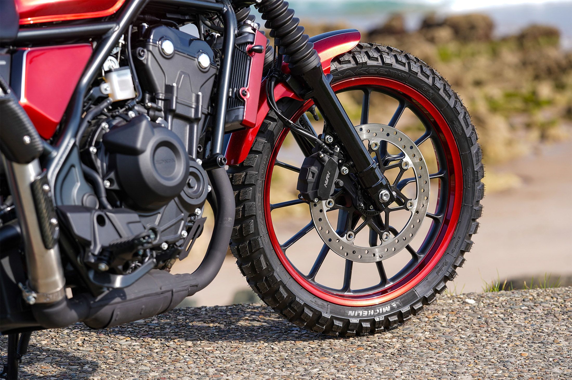 More off-road chic from Charade Moto, with a hint of flat track; the Tricolour paint adorning Charade Spirit is that most classic of Honda colour schemes and is especially appealing when matched to the aggressive block tyres, high level front mudguard, single side number board, knuckle guards and high-level single exhaust muffler.