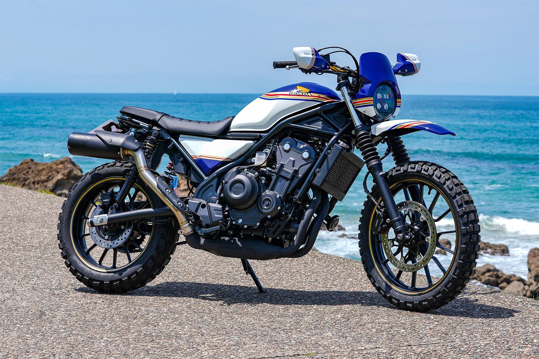 Showing what a little thought, some choice parts and a sprinkling of Genuine Honda Accessories can do, Sterrato 500 (‘dirt road’ in Italian) created by Unit Garage raises the CL500’s off-road potential while referencing famous models from Honda’s past. Features include high front mudguard, headlight cowl, knuckle guards, leather seat, Öhlins rear shocks and block tyres.