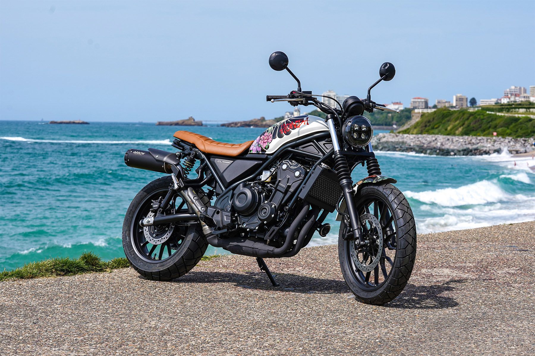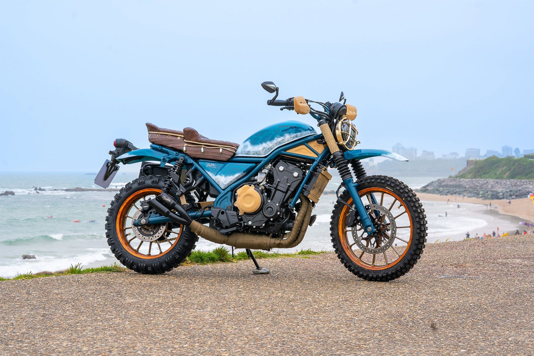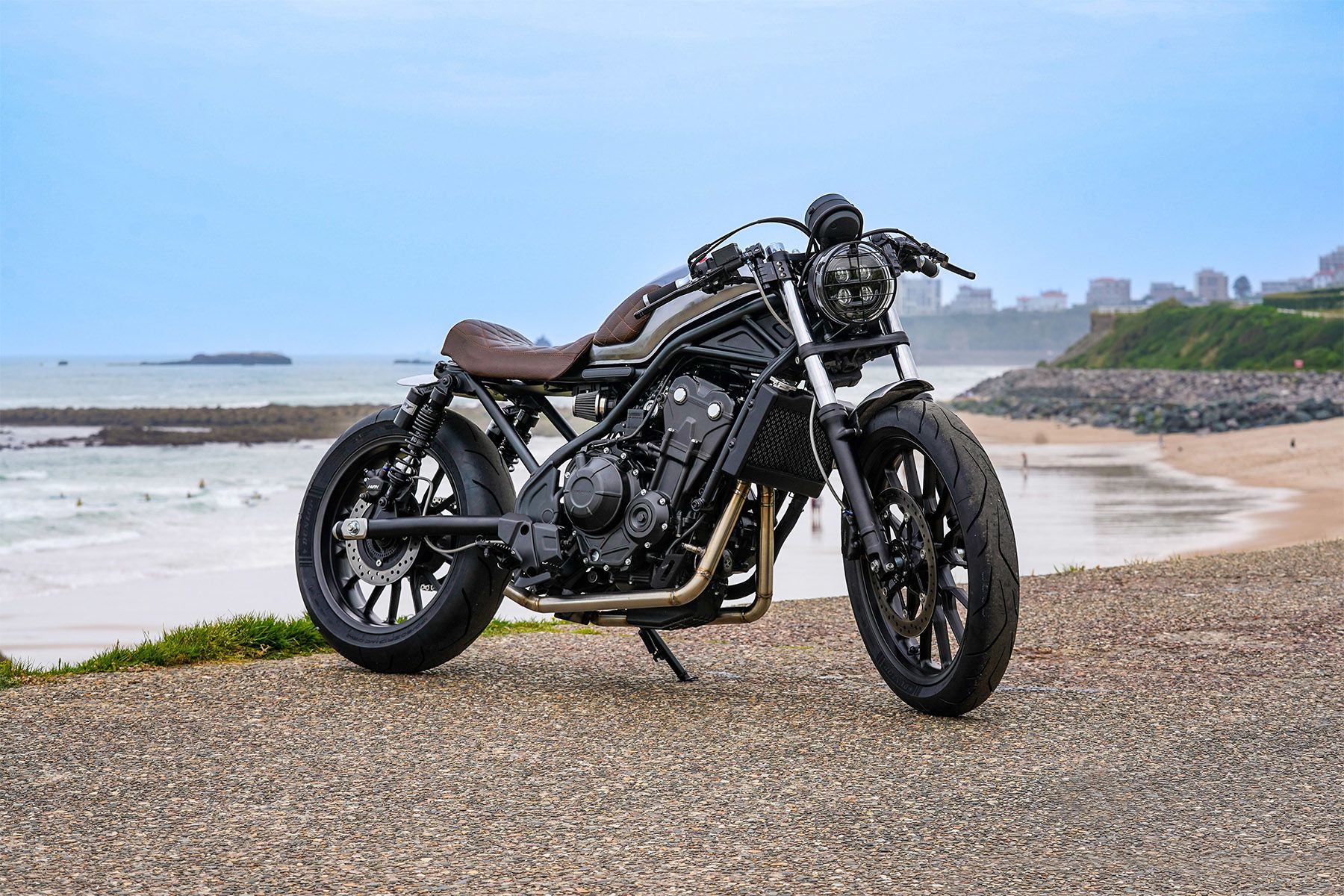 The bike’s name was chosen because Wheels and Waves takes place next to the beautiful beach of Biarritz and exudes a laid-back surfing vibe. Created by the team at the flagship Honda Centre dealership in Frankfurt, the CL Surfer fits the mood, with its metallic silver fuel tank and front and rear mudguards (with signature blue stripe), plus clip-on handlebars, new exhaust and distinctive brown leather bench seat.