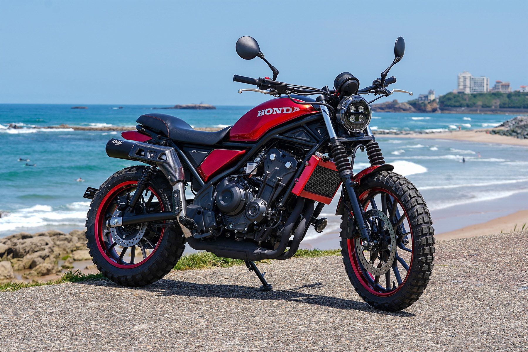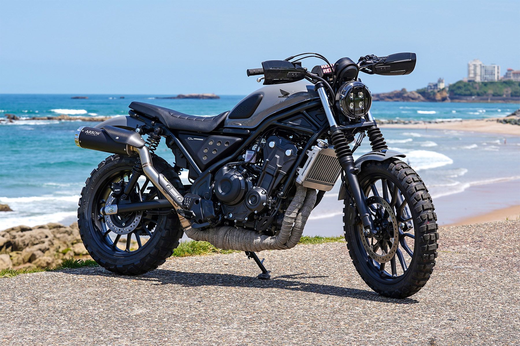 Terra Battuta 500 moves the CL500 in the direction of a long-distance travel all-rounder with stylish, versatile carrying capacity and an array of parts that make life on the open road that little bit easier and more enjoyable. It features a brushed aluminium front mudguard, engine bars, luggage carriers, black anodised luggage rack, tall screen with integrated GPS support, block tyres - and skateboard!