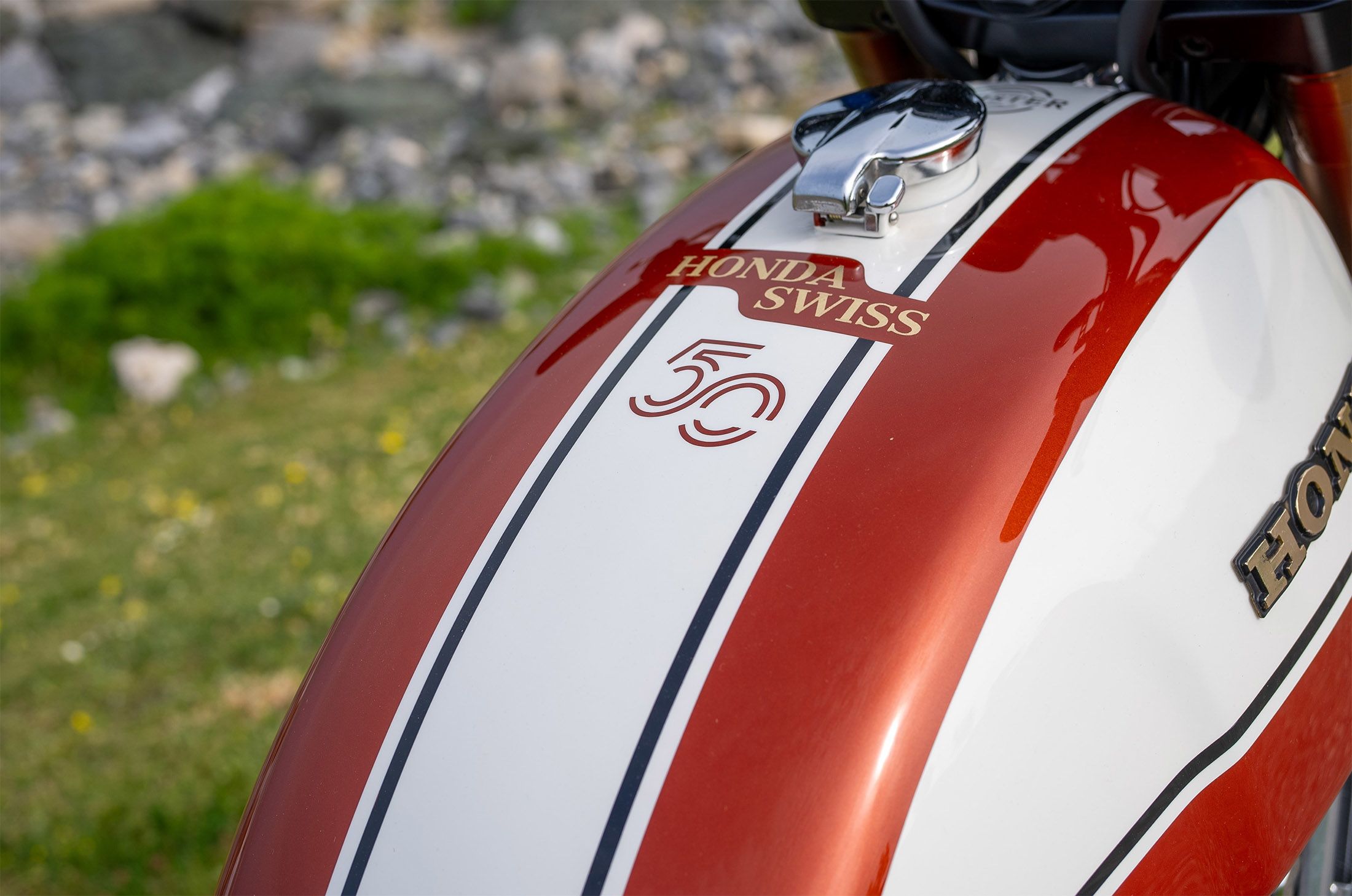 Built in cooperation with Meister Engineering and celebrating 50 years of Honda Switzerland, Alpina 500 draws on Honda’s heritage while referencing details and elements of one of Europe’s most beautiful countries. The Alpina 500 stands out from the competition with its CB-style fuel tank, stripped subframe, and minimalist bench seat.