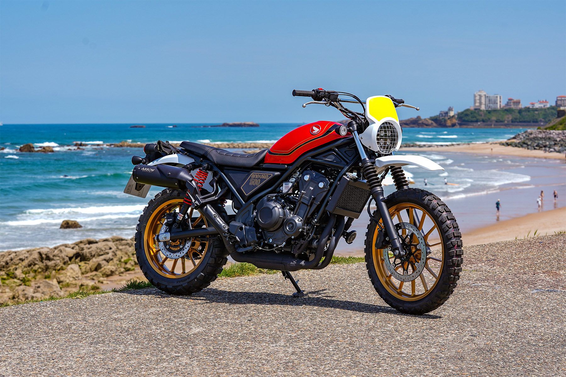 A tribute from the Stilmoto dealership to classic Spanish enduro bikes, the Enduro 500 is designed to tug on the heartstrings with memories from a beautiful, golden era of motorcycling history. It features eye-catching tank paintwork, high front mudguard, headlight cover, number board, a variety of handmade parts and Arrow exhaust muffler.