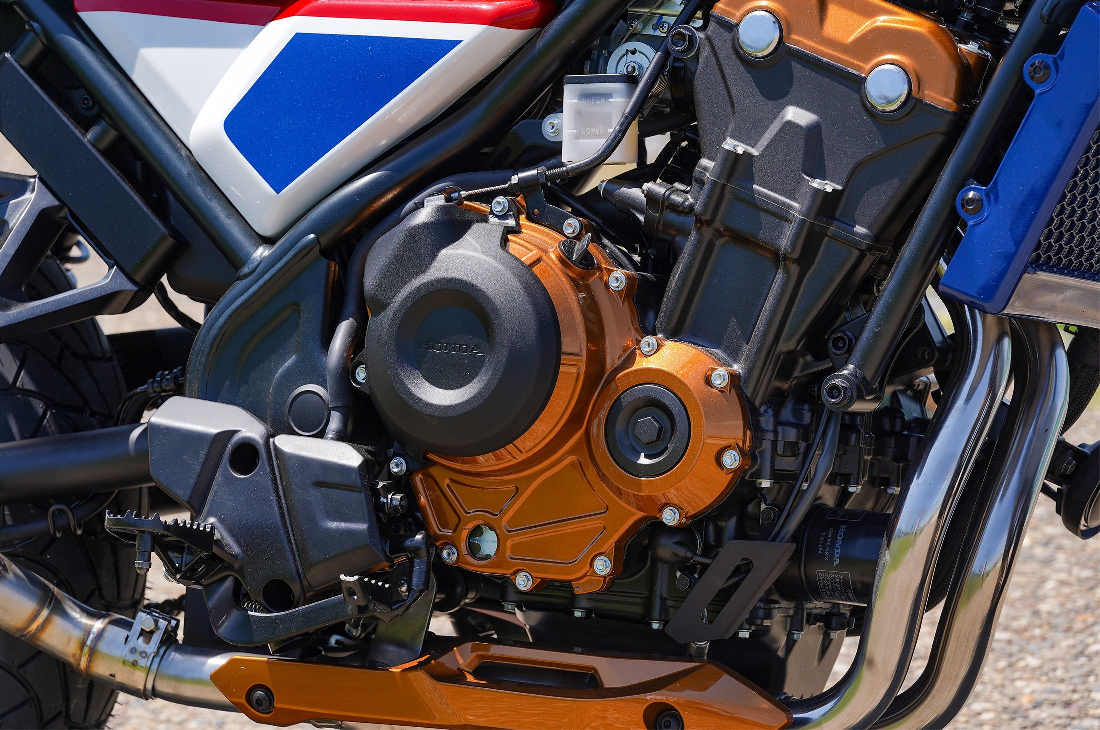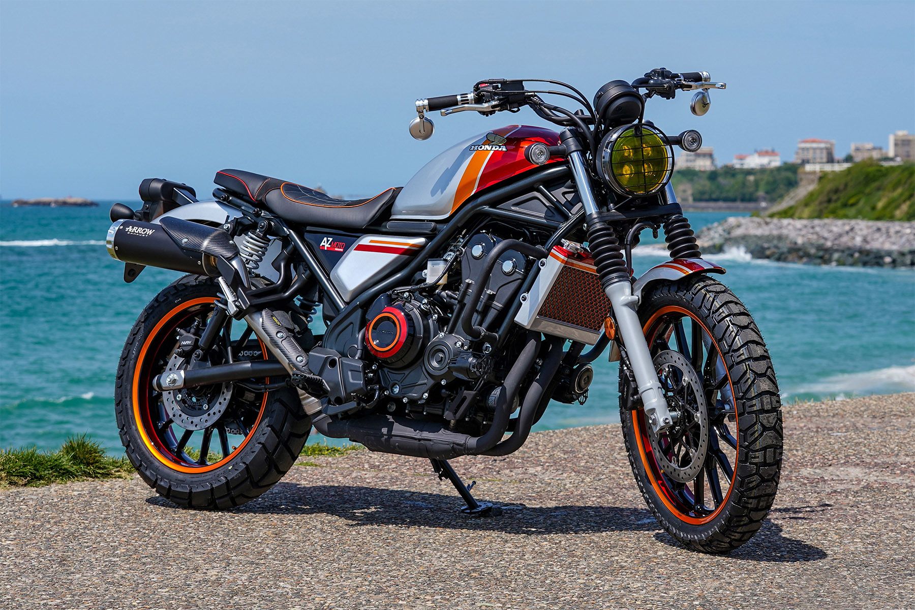 There’s a 1970s street scrambler vibe about AZ Moto’s custom CL500 and its gorgeous orange and cherry red paint. New rear shocks and the high-level single exhaust muffler complete its Californian look.