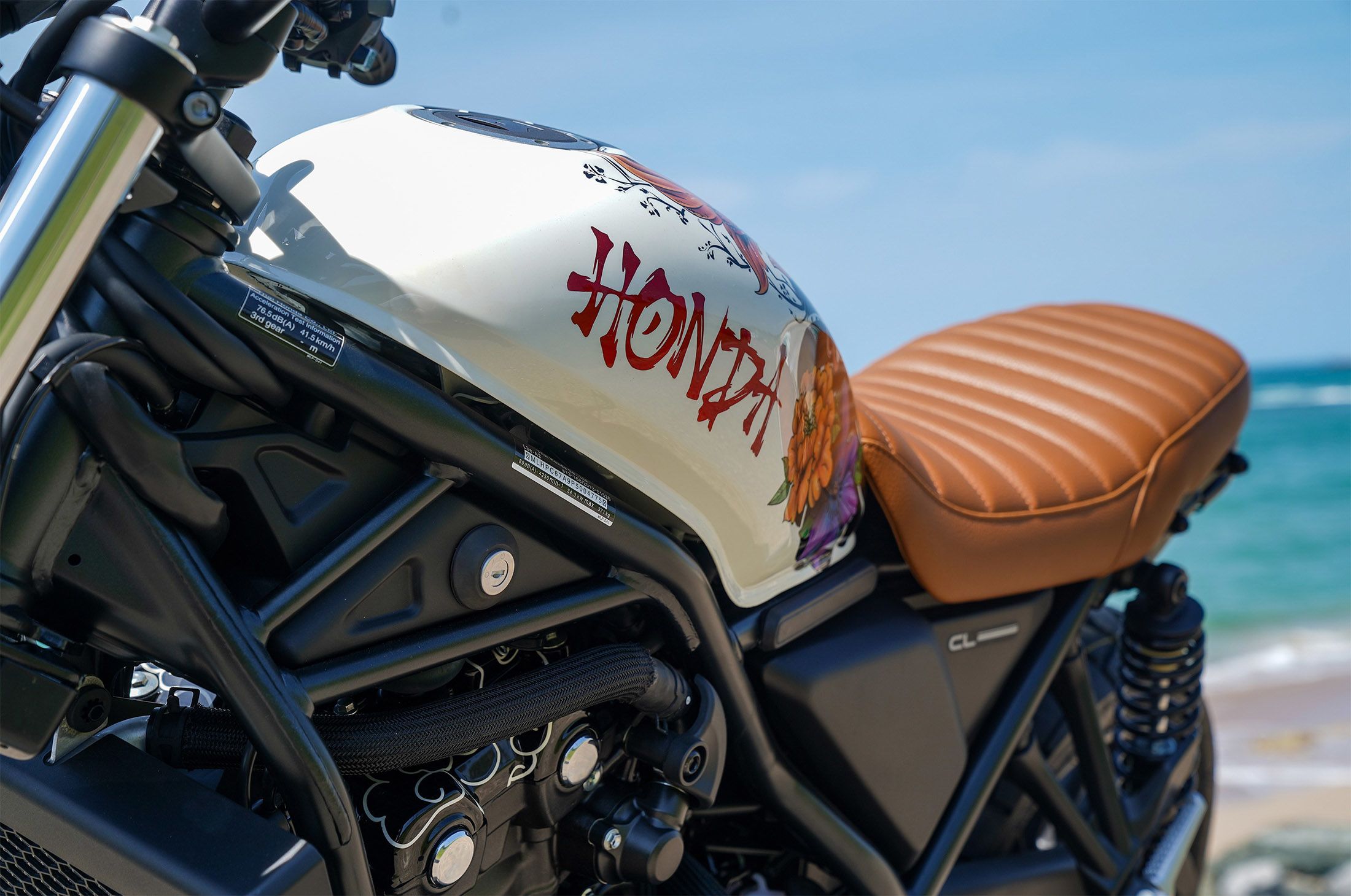 It’s fair to say the stripped-down ‘Irezumi’ from Starbike Honda is a bit of a celestial entity. The intricate artwork on the tank draws people in, and the minimised rear end and high-level exhaust with single satin muffler and tan seat set this bike apart from its peers.