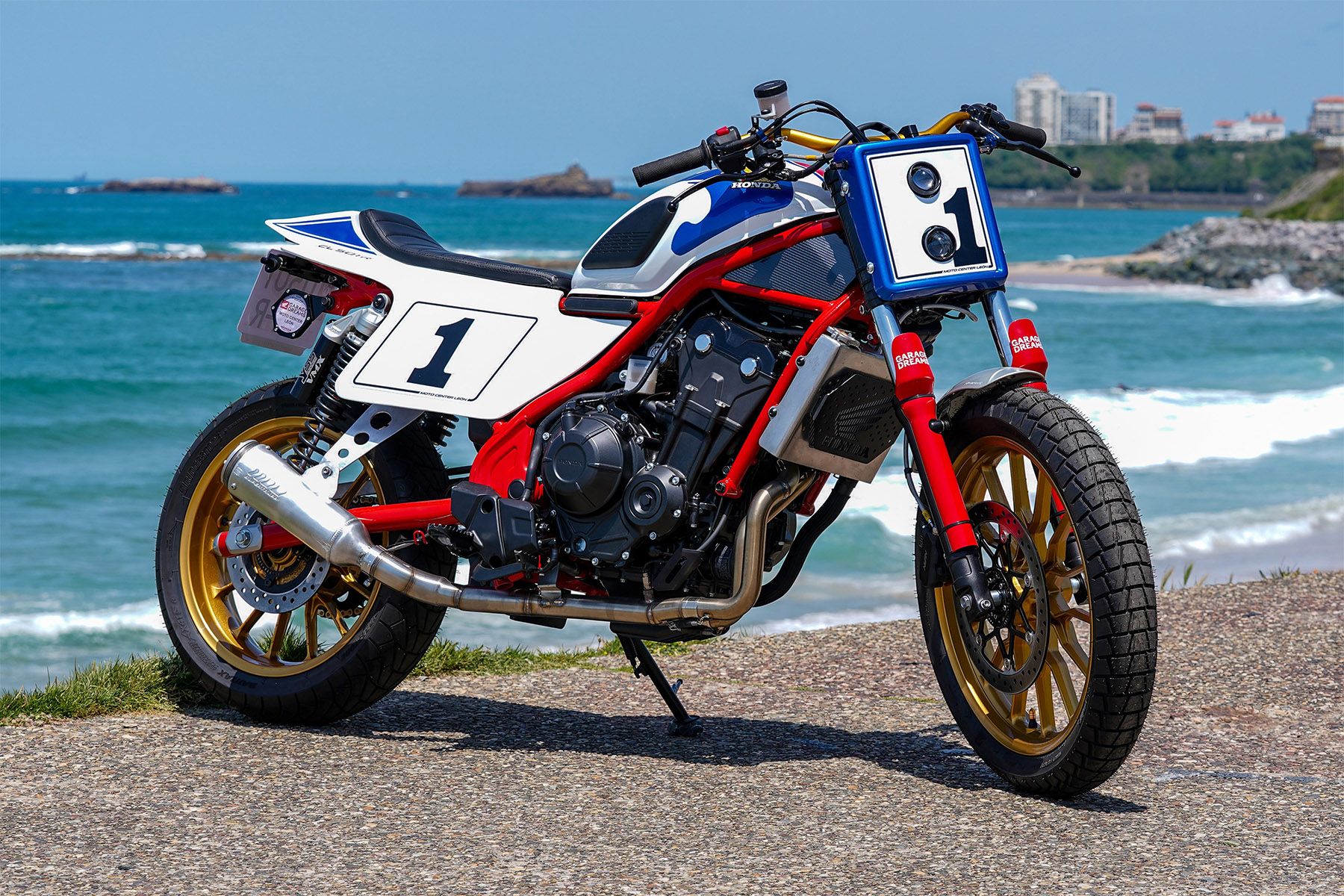 Inspired by American flat track racing, Flat Track 500 is Belgium’s first entry into the hondacustoms.com competition. It celebrates the sort of purposeful aesthetic that competition machines so effortlessly exude. Equipped with Öhlins rear shocks, cantilever swingarm, straight handlebars, new wheels, a new rear brake, lowered exhaust, modified rear subframe and stunning paint for the fuel tank, Flat Track 500 is every bit the celebration of dirt track racing.