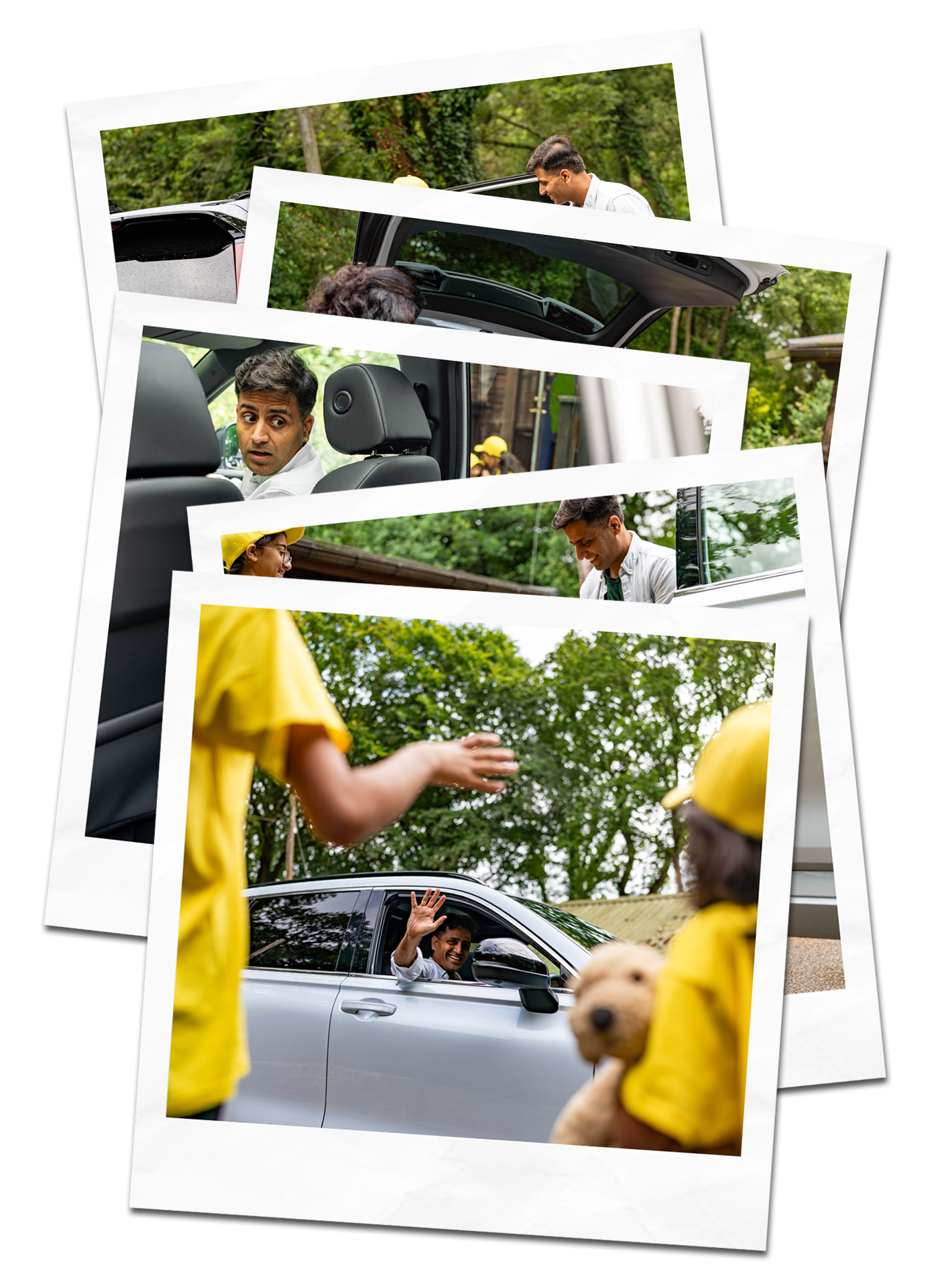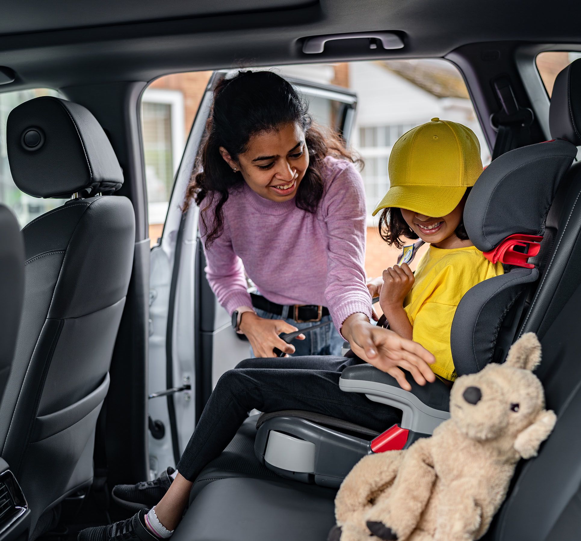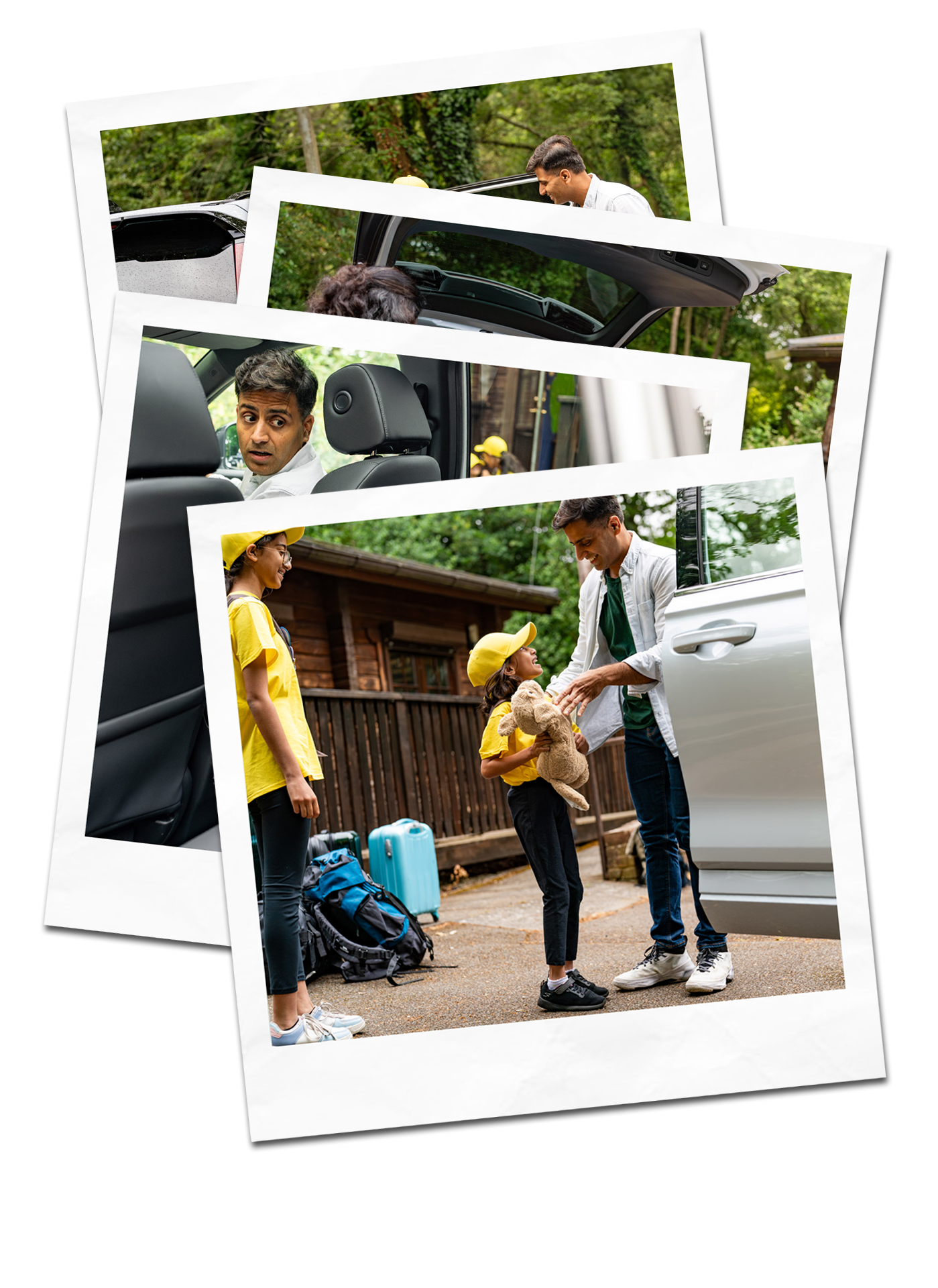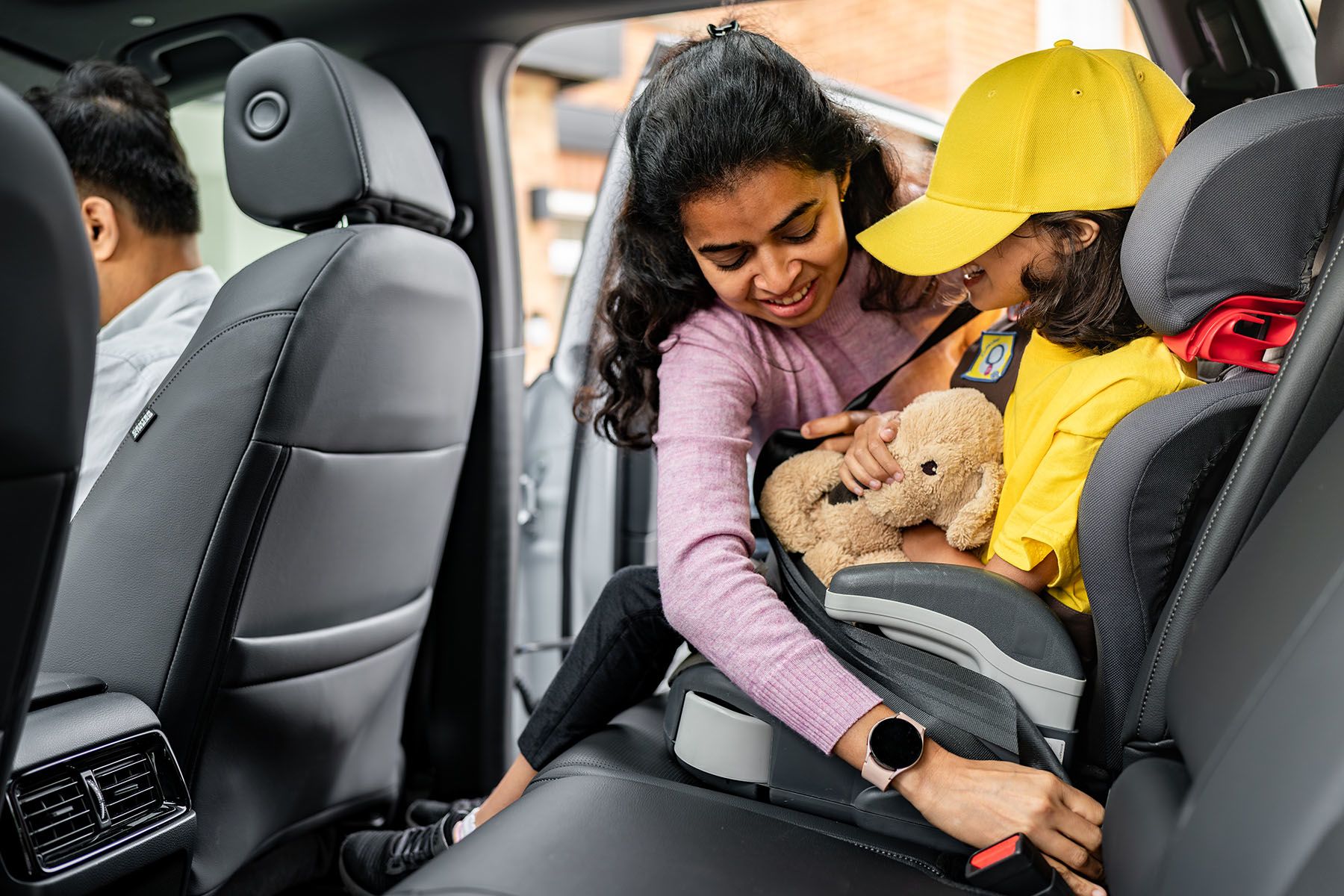 As they handed the bag to their daughter, Dad's eyes fell on the back seat. There, still securely strapped in, was the teddy bear that had almost been forgotten in the excitement. With a warm smile, he reached in, unbuckled the teddy, and handed it to his daughter. Her face lit up even more as she took it from him, clutching the soft toy close to her chest. It was the final piece she needed to feel ready for this adventure.