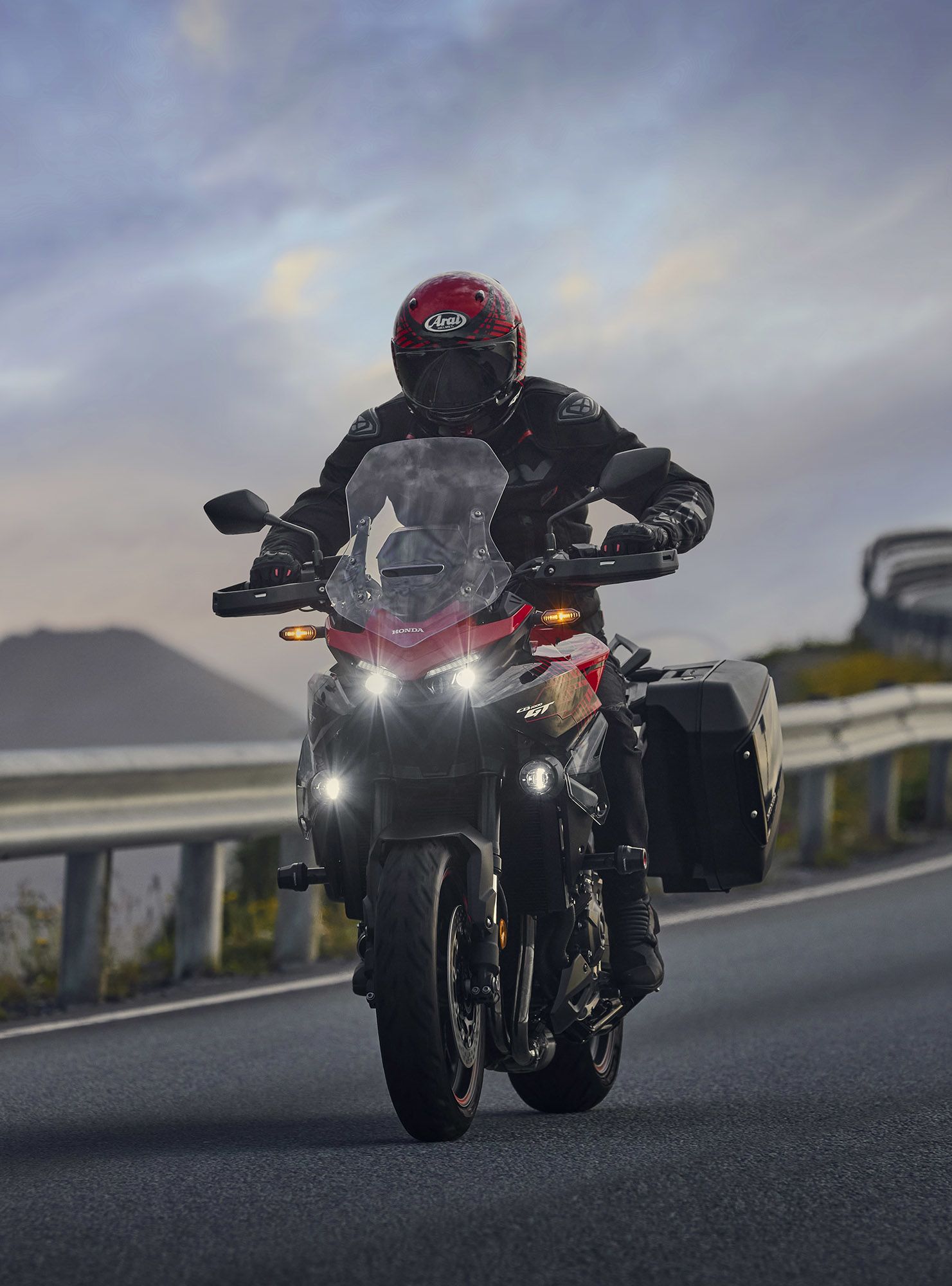 Standard kit includes heated grips, cruise control, panniers, quickshifter, and a five-inch TFT with Honda RoadSync. Aerodynamic fairing and adjustable screen provide superb wind protection, while sustainability touches like bio-material panels show Honda’s forward-thinking approach.