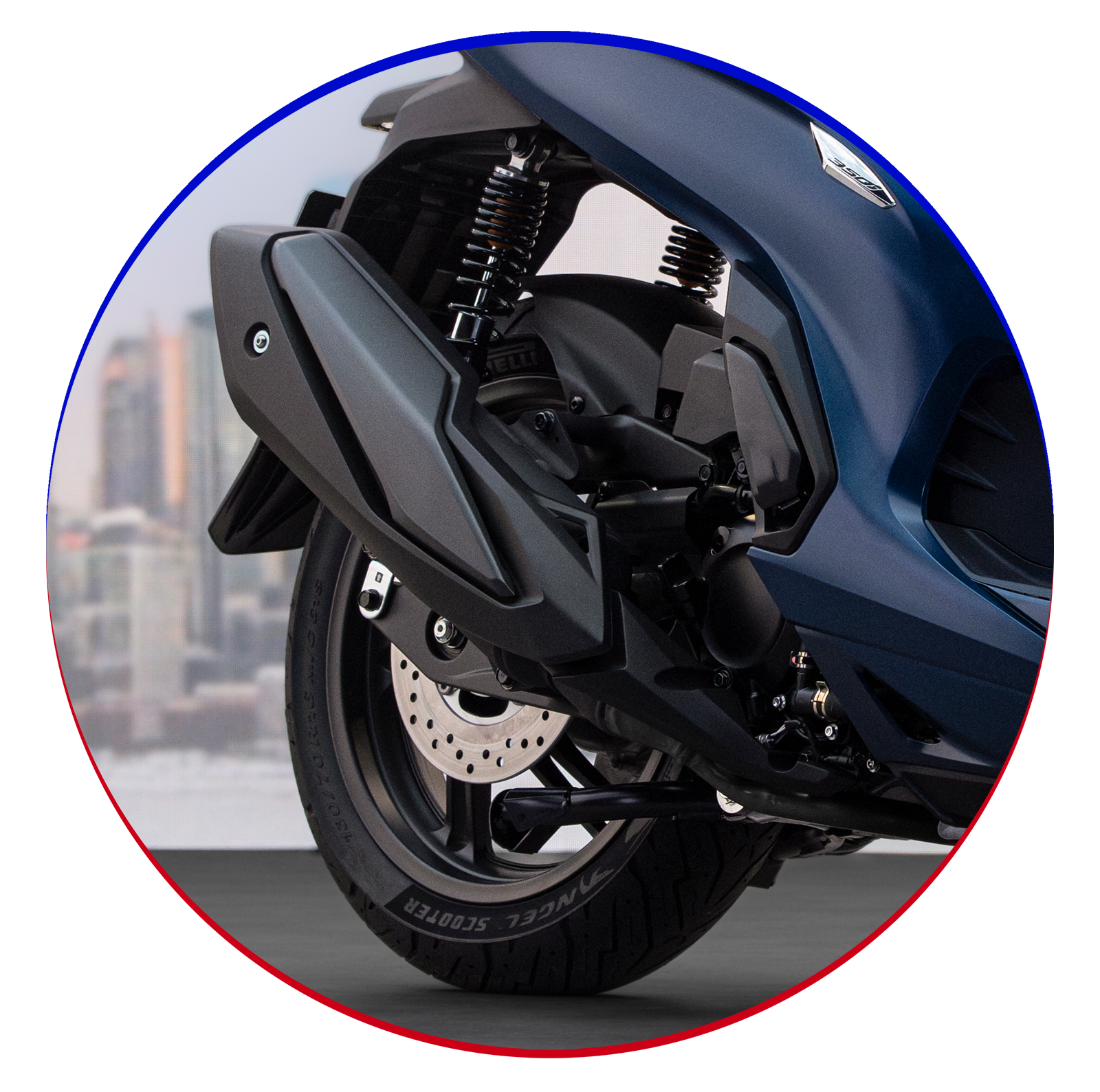 A reduction in internal friction, together with hydraulic cam chain adjustment and scavenger pump, guarantees the engine’s legendary durability. Meanwhile, the auto-centrifugal clutch and V-Matic transmission transfer power to the back wheel via belt drive.