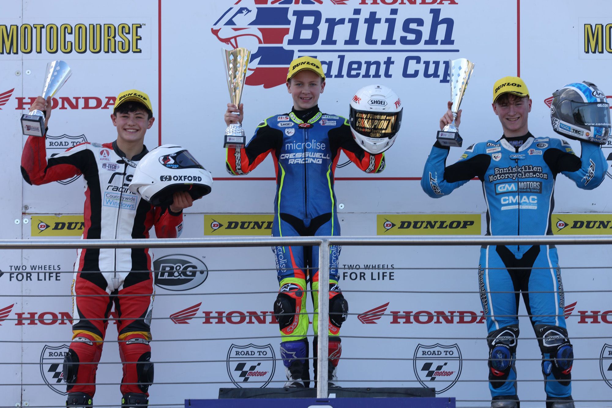 Casey O'Gorman (Microlise Cresswell Racing) ended the season on a high as the number 67 put in another stunner at Donington Park to secure the 2021 Honda British Talent Cup. Getting the holeshot and, this time in the dry, putting in another dominant performance saw the points leader wrap up the crown in style as closest Championship rival Carter Brown (City Lifting by RS Racing) came home second. Jamie Lyons (C&M Motors Ltd/Tooltec Racing) locked out the podium, ending the season with another top finish.