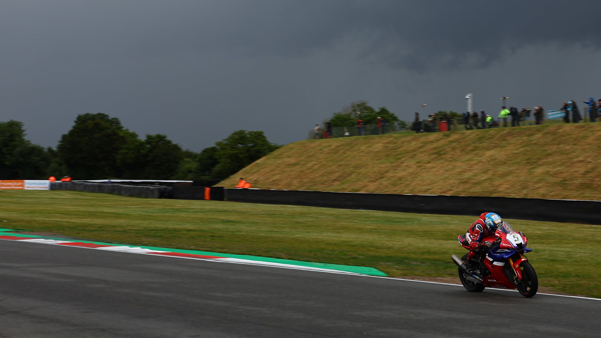 In the sole Bennetts British Superbike race of the day, a rapidly drying track made tyre choice and setup a gamble for the entire field, as teams up and down the grid weighed up their options. All three Honda riders opted to fit wet fronts and an intermediate rear, assuming that the forecast would remain clear and a dry line would slowly appear. As the lights went out and with a wet track beneath them though, others who had opted for full wet tyres raced ahead and pulled out a large gap. At the time of the red flag on lap nine, Tommy was down in tenth, Andrew sixteenth and Dean was back in twenty-second.