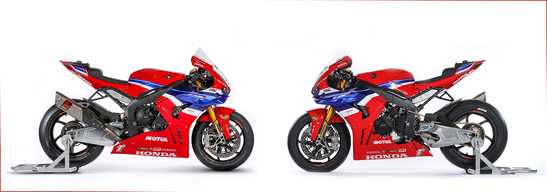 The iconic red, white and blue of Honda Racing Corporation heavily influence this year’s livery, with a clear nod towards the designs adorned on the respective production models.