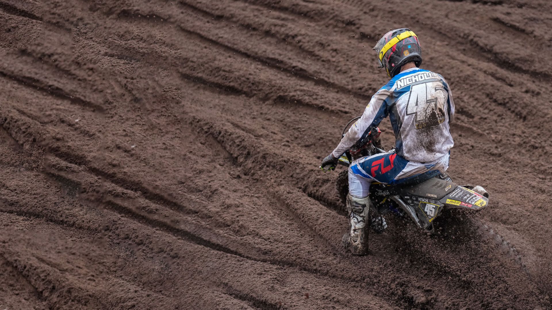 After retiring from full-time professional racing following an injury in 2022, Nicholls contested several one-off races in 2023 but is now back to race again in the British MX2 championship. He made a solid start in the first MX2 moto, chasing the leading pack which included GP and European championship riders including current world champion Andrea Adamo. Really enjoying his racing again, the Suffolk star pushed right to the end of the heat to take seventh place in the rutty conditions. He was close to the two riders in front but broken goggles meant he couldn’t make a challenge to pass.