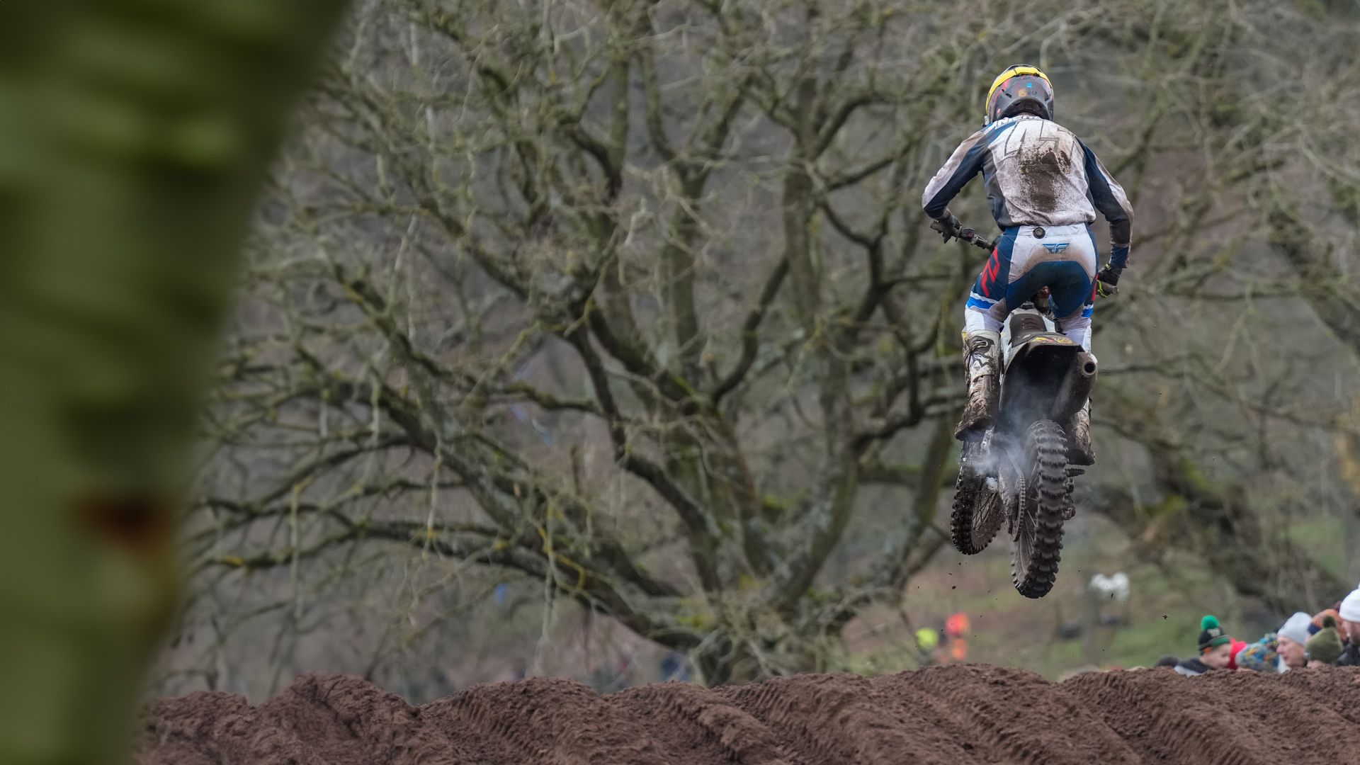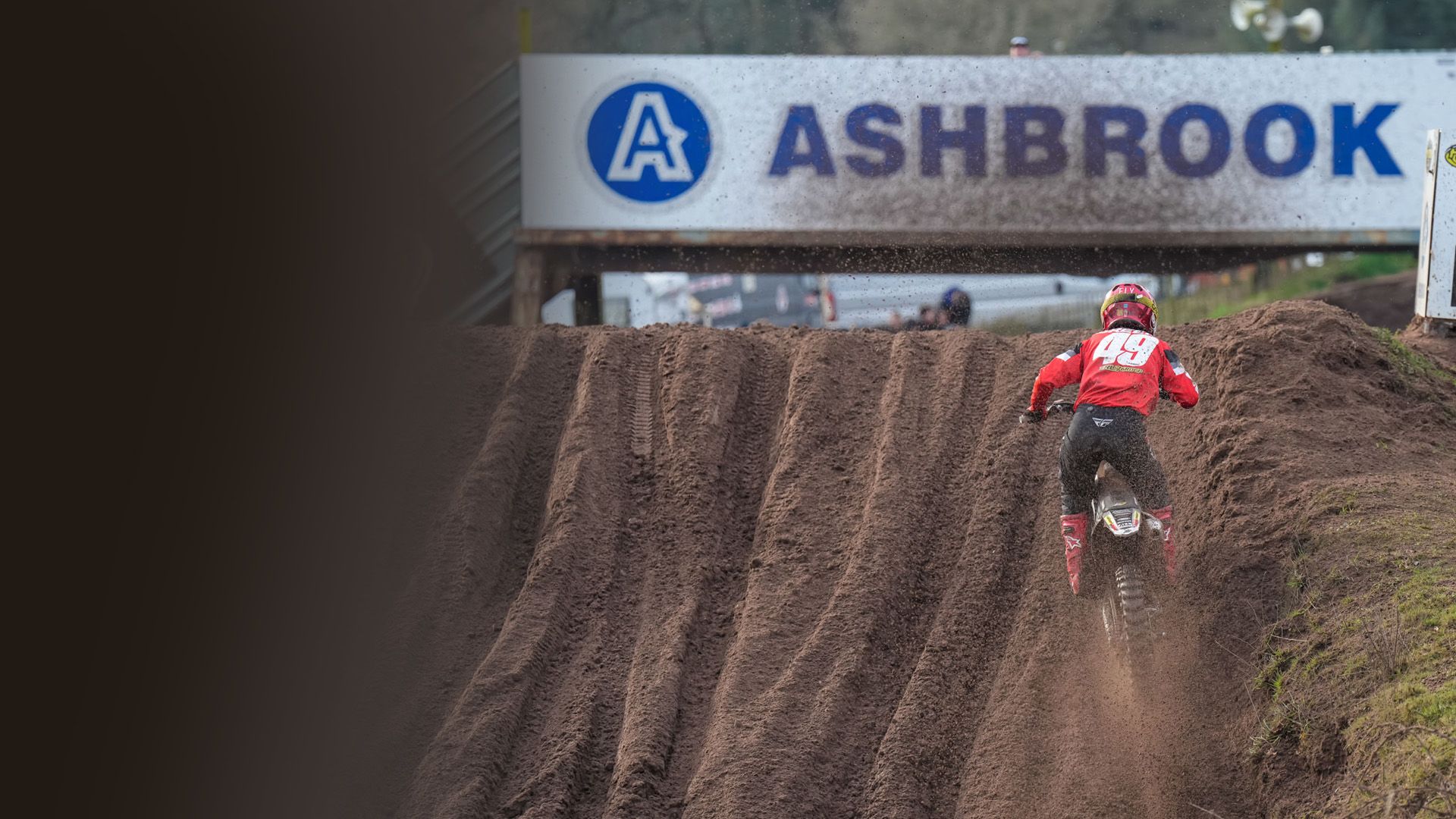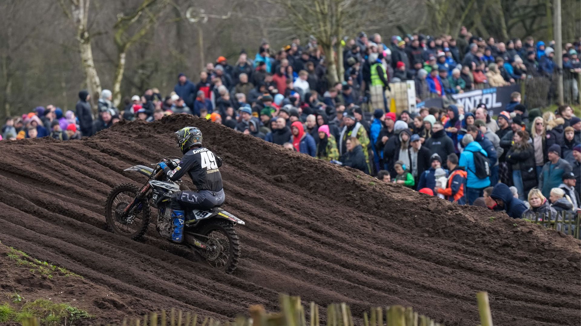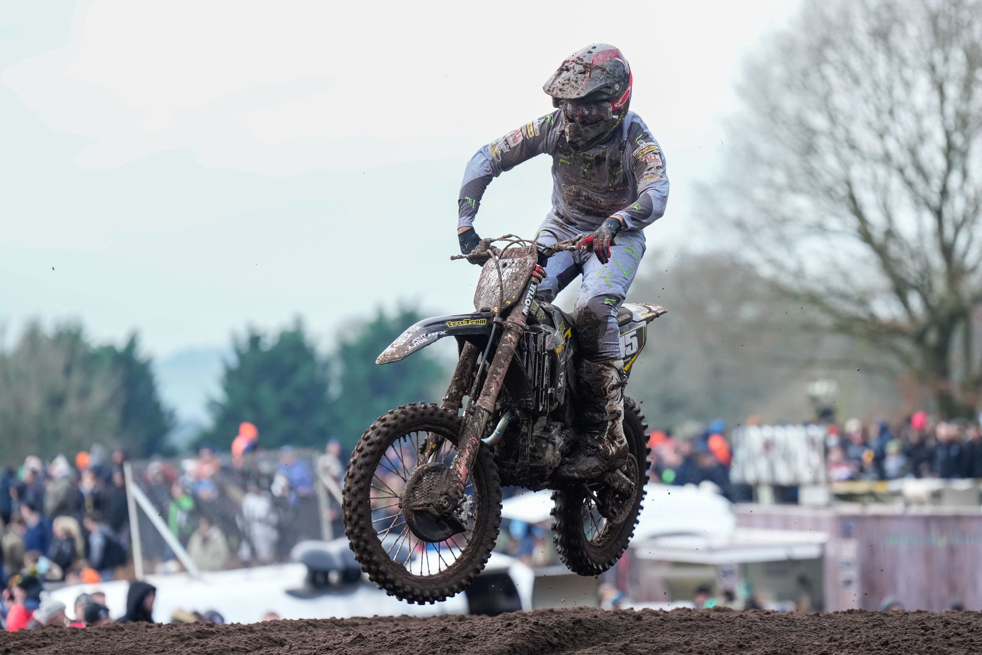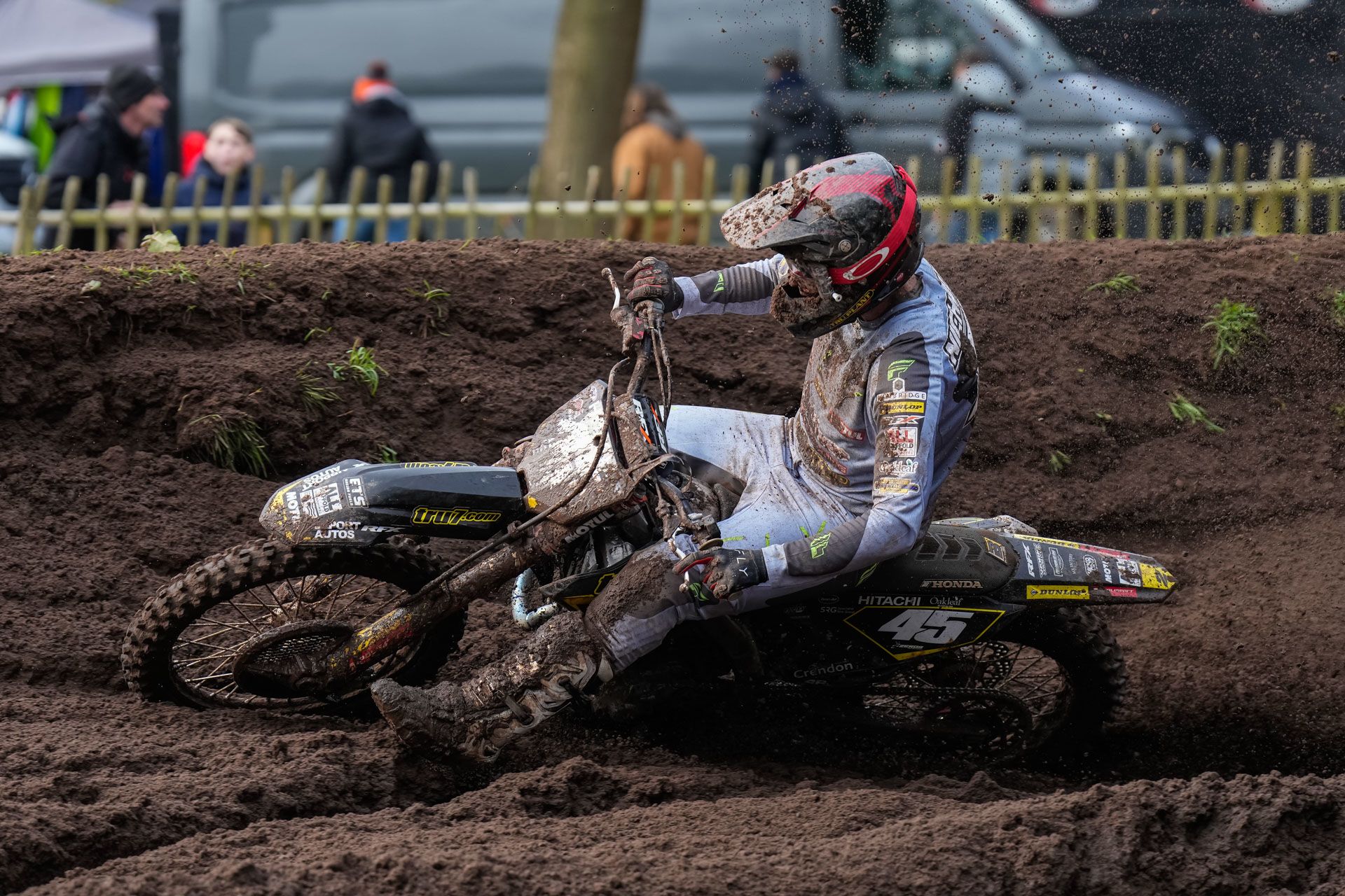 This time he escaped trouble on the opening lap and came around ninth at the end of the first lap, mixing it up with the cream of the 450 riders. But early on his goggles got damaged and he had to take them off, so struggled to keep up the pace while getting roosted by the bigger bikes. He crossed the line in 16th spot overall, but that was fourth in the MX2 class and the best result by a British rider.