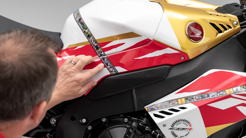 Based on the top-specification 30th Anniversary CBR1000RR-R SP, the gold detailing mirrors the livery of the history-making Fireblade ridden by John at last June's Isle of Man TT races.